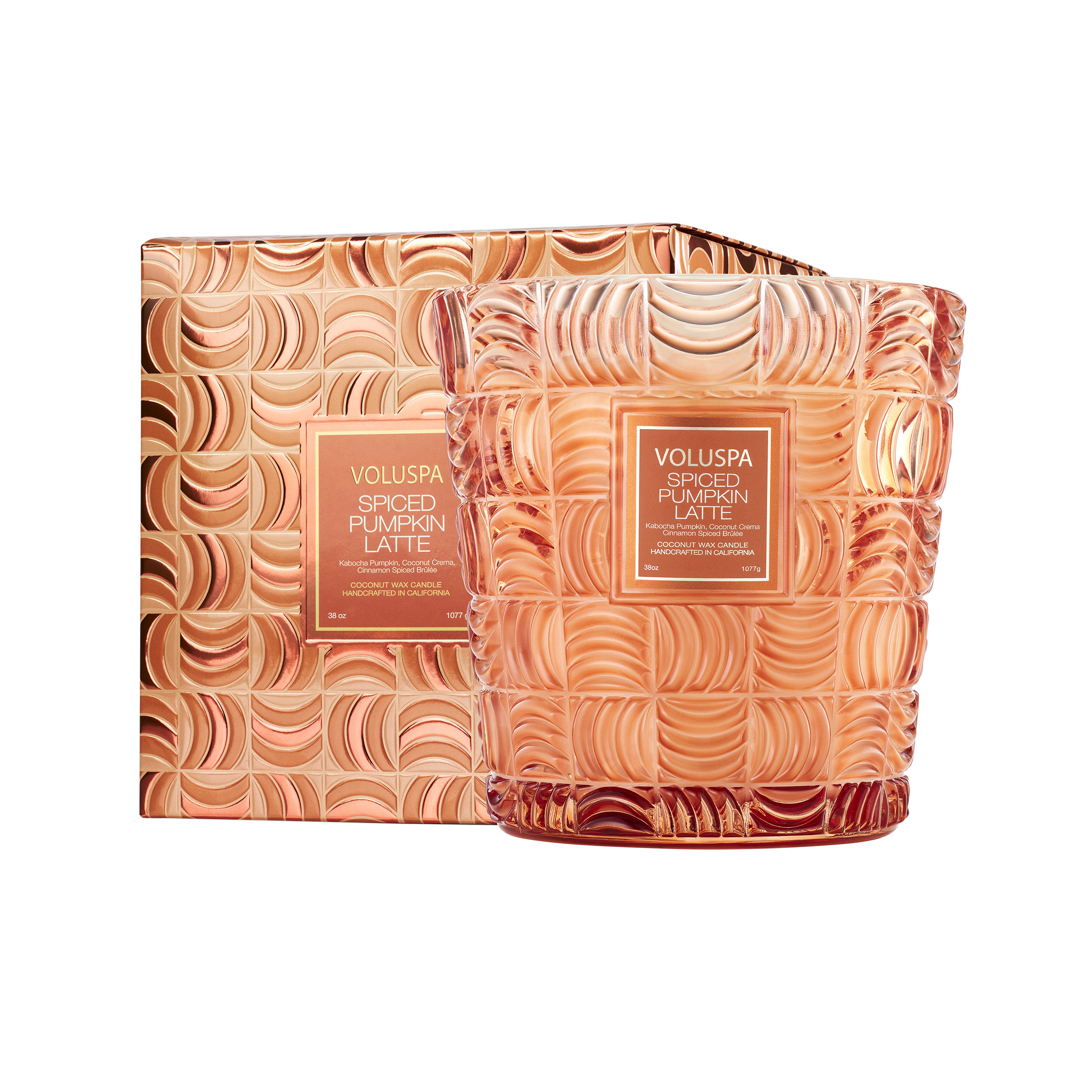 A Vela Voluspa Spiced Pumpkin Latte em copo de vidro combina fragrância envolvente e design marcante para transformar o ambiente com aconchego e personalidade. Sua composição gourmand traz notas de abóbora fresca, leite de coco cremoso, marshmallow de baunilha, creme brûlée e canela, criando um aroma quente e acolhedor.